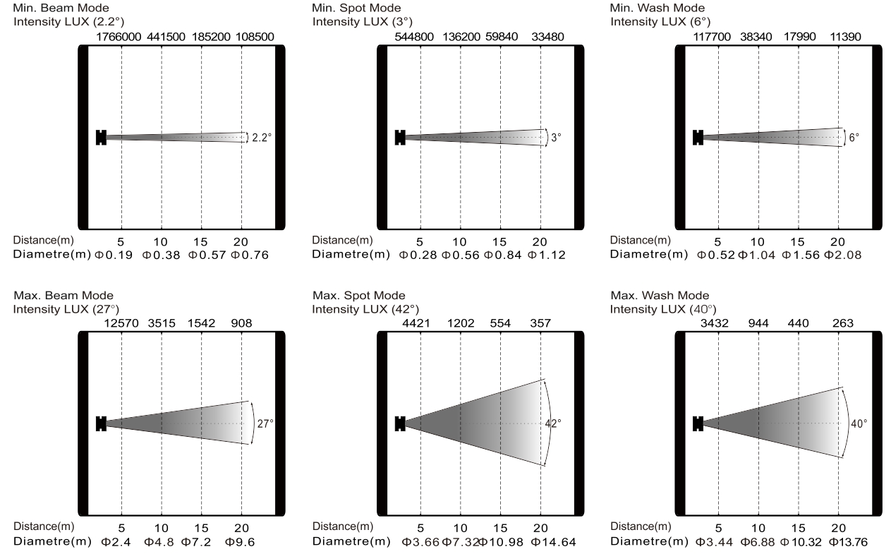 變焦范圍:光束模式:2.2°-27°,圖案模式:3°-42°,染色模式:6 -40°